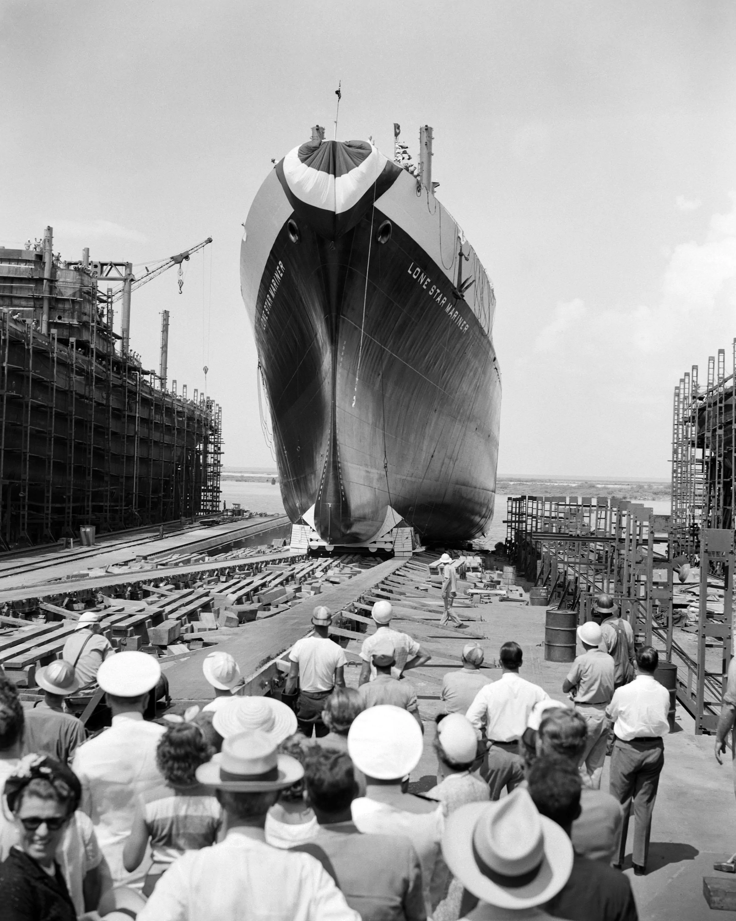 Shipbuilders gather to watch the SS Lone Star be launched. The C-4 Mariner-class general cargo vessel was completed in 1952 at Ingalls.