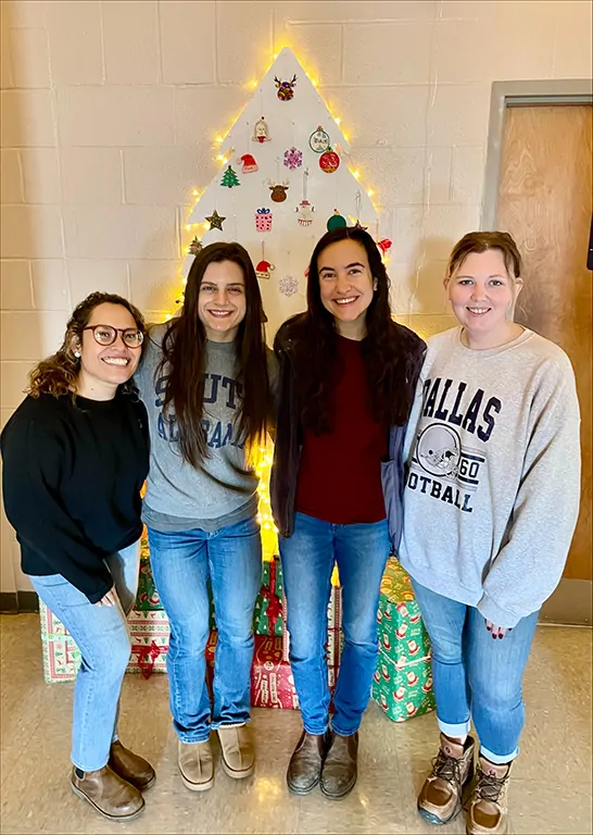 The Safety office is decorated with reindeer and handmade ornaments by shipbuilders’ children. Pictured from left, are a few of the Safety team members who helped get the office into the holiday spirit: Xiomara Jiminez, Caitlin Raines, Alexis Moran and Haley McGee.