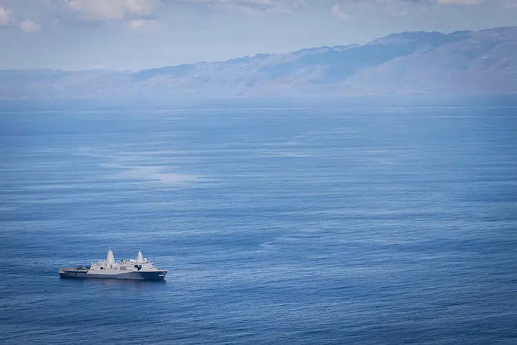 USS San Antonio (LPD 17), the lead ship of its class, sailed off the coast of Jamaica on Nov. 8, 2025, to deliver lifesaving aid following the devastation of Hurricane Melissa.