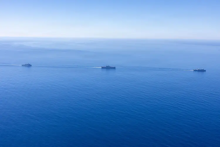 Whidbey Island-class amphibious dock landing ship USS Comstock (LSD 45), left, Wasp-class amphibious assault ship USS Boxer (LHD 4), center, and San Antonio-class transport dock ship USS Portland (LPD 27) sail in formation in the Pacific Ocean, Feb. 27, 2026.
