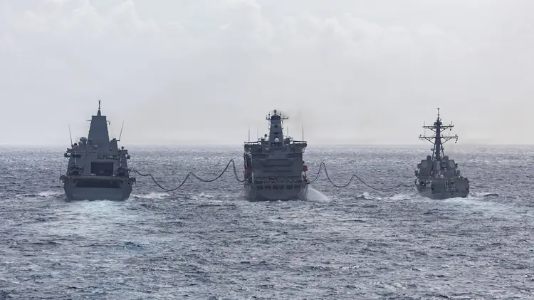 USS San Antonio (LPD 17), pictured left, and USS Gravely (DDG 107), right, moved into a tight formation with USNS Joshua Humphreys (T-AO 188), center, on Oct. 20, 2025. The three ships carried out a coordinated replenishment-at-sea while in the Caribbean, a routine evaluation that reached far beyond fuel lines.
