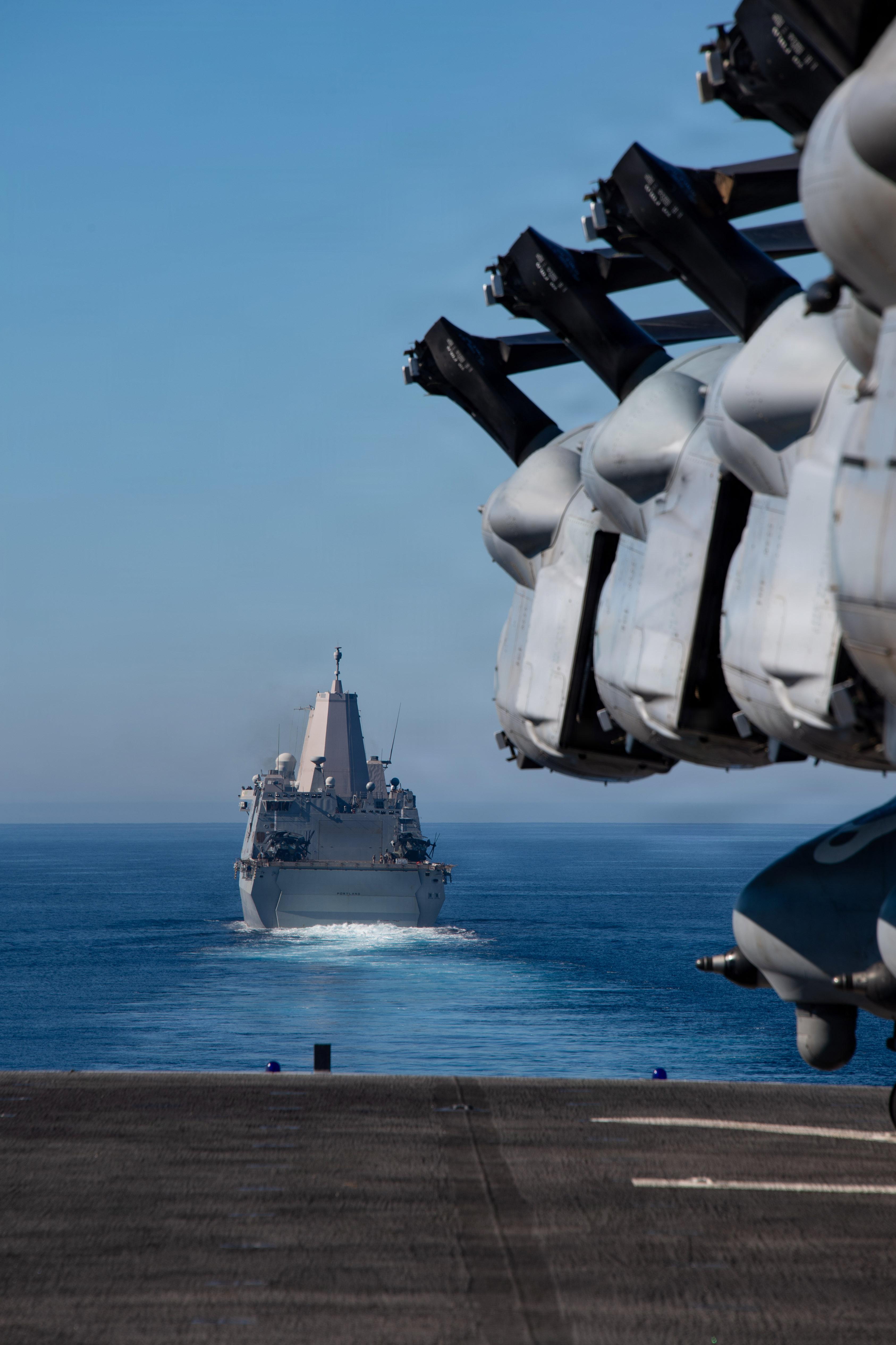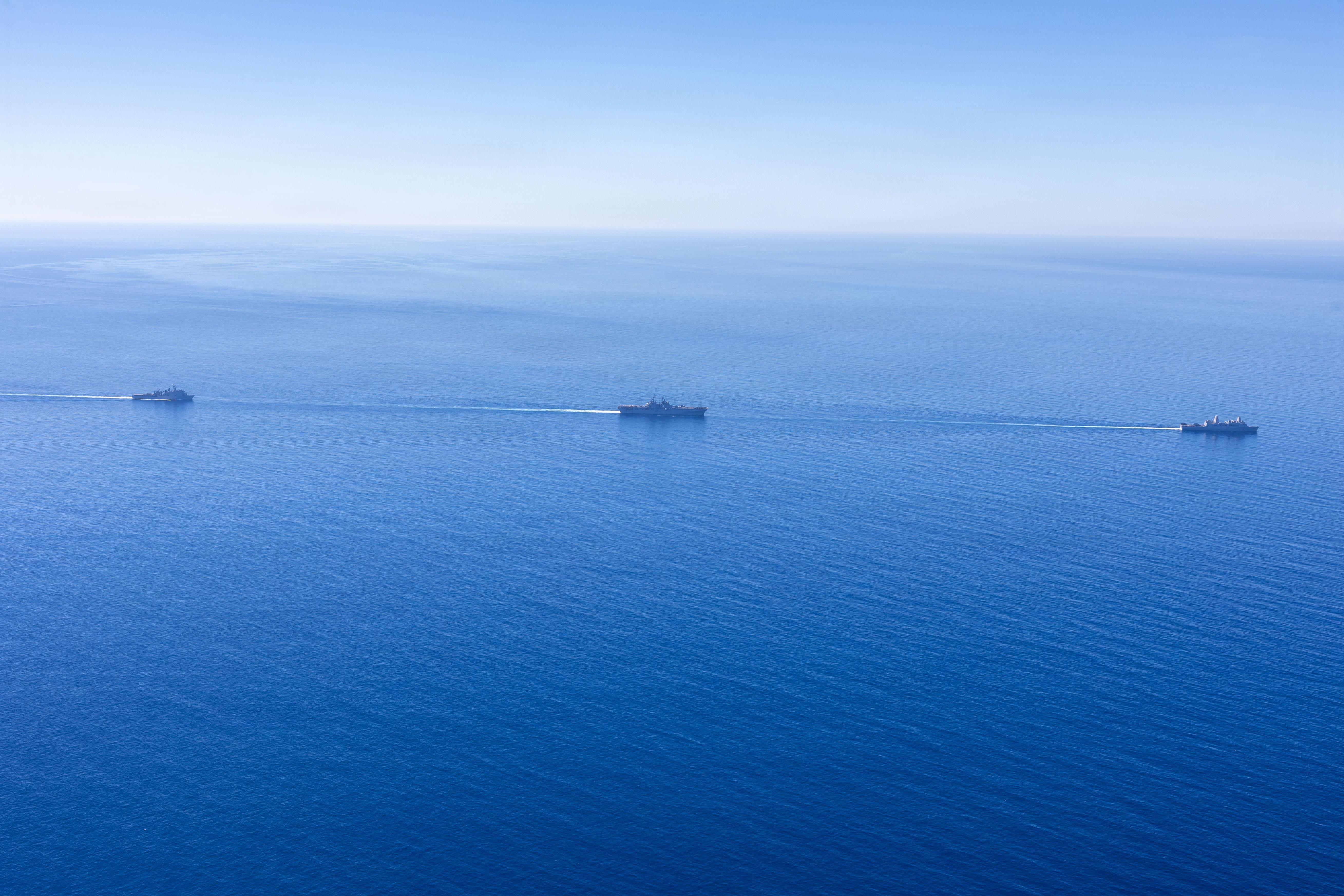Whidbey Island-class amphibious dock landing ship USS Comstock (LSD 45), left, Wasp-class amphibious assault ship USS Boxer (LHD 4), center, and San Antonio-class transport dock ship USS Portland (LPD 27) sail in formation in the Pacific Ocean, Feb. 27, 2026.