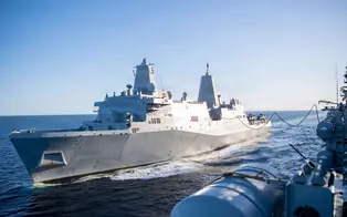 San Antonio-class amphibious transport dock ship USS Portland (LPD 27) attaches a fuel line from Wasp-class amphibious assault ship USS Boxer (LHD 4)— both Ingalls-built ships—during a simulated fueling-at-sea, Jan. 28, 2026.