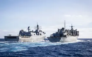 Ingalls-built USS Tripoli (LHA 7) refuels Arleigh Burke-class destroyer USS Rafael Peralta (DDG 115) during replenishment at sea in the Philippine Sea, Feb. 10, 2026. The Tripoli Amphibious Ready Group—USS Tripoli, USS New Orleans (LPD 18), USS San Diego (LPD 22)—and the 31st MEU are conducting routine operations in the U.S. 7th Fleet area, working with allies to ensure a free and open Indo-Pacific.