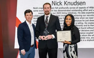 Nick Knudsen joined Ingalls just over two years ago and quickly became a key player in Human Resources & Administration (HR&A). His behind-the-scenes work drives decisions across the shipyard. When the HR&A team voted in the first‑ever People’s Choice Awards, Nick never expected to hear his name — much less for the top honor. Being named the 2025 Most Valuable Player was a surprise that left him genuinely moved.