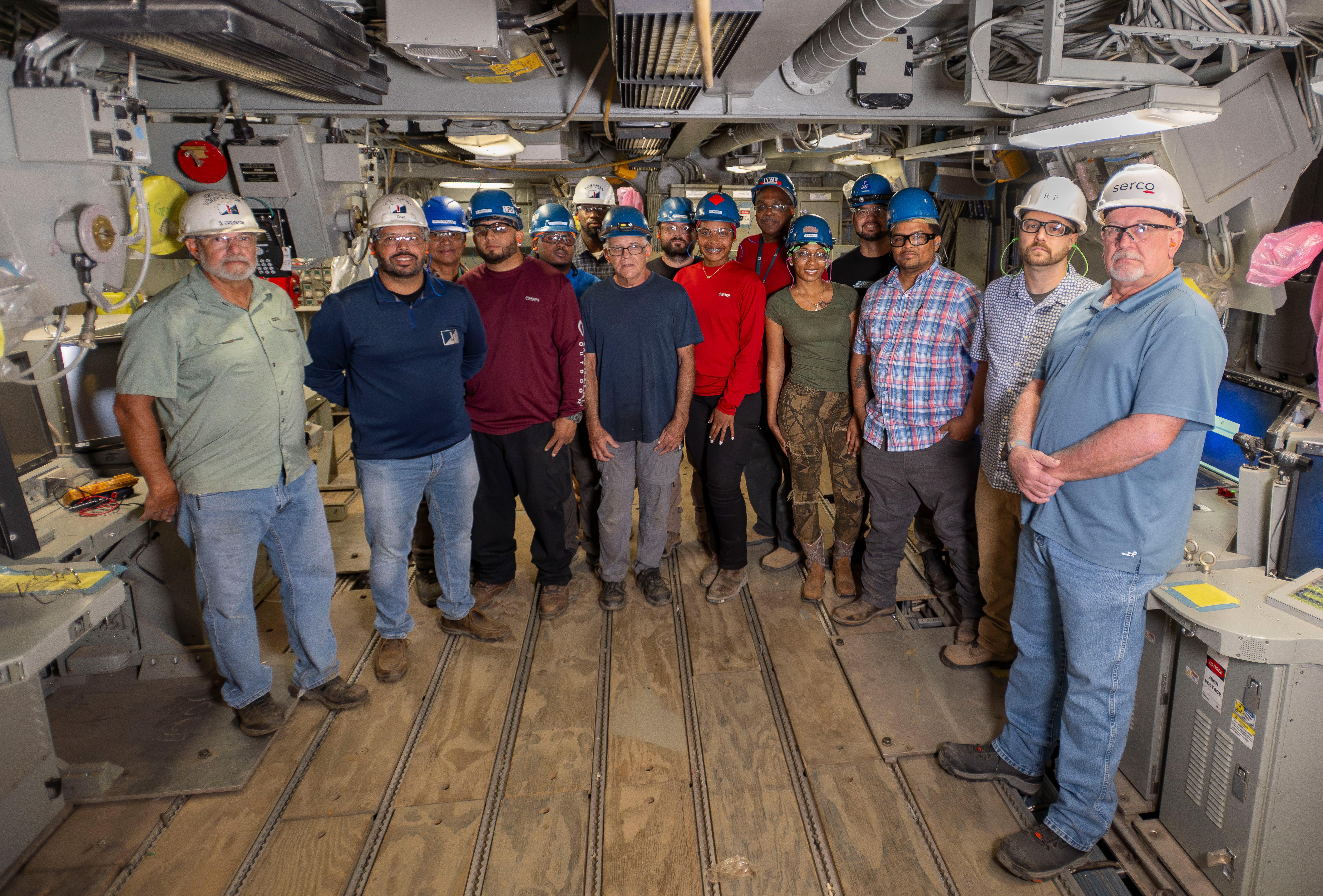 PRESCISION & SKILL Shipbuilders across all crafts work together to prepare the spaces, install equipment, run cable, tie in ventilation and cooling, and protect sensitive electronics. Once Ingalls teams complete their part, the system moves to Navy testing, but it starts with the work done here.