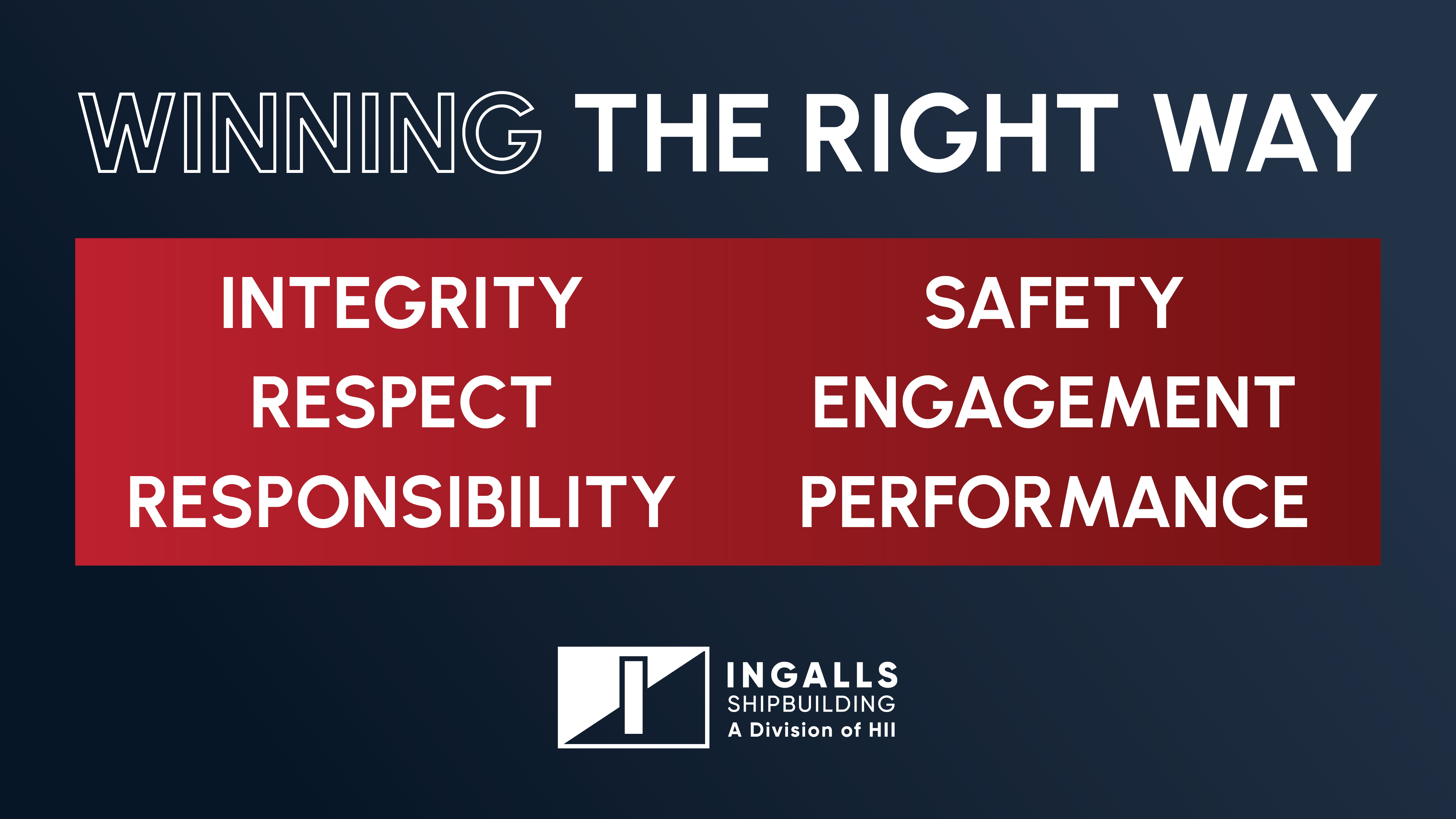 At Ingalls, our success is not defined only by delivering ships and meeting milestones. It is defined by how we do the work, how we treat one another, how we uphold standards, and how we take ownership of the mission in front of us. The stakes are high, the timelines are demanding, and the work is complex. That is why our values—Integrity, Safety, Respect, Engagement, Responsibility, and Performance —must guide every decision we make on the deckplate and beyond.